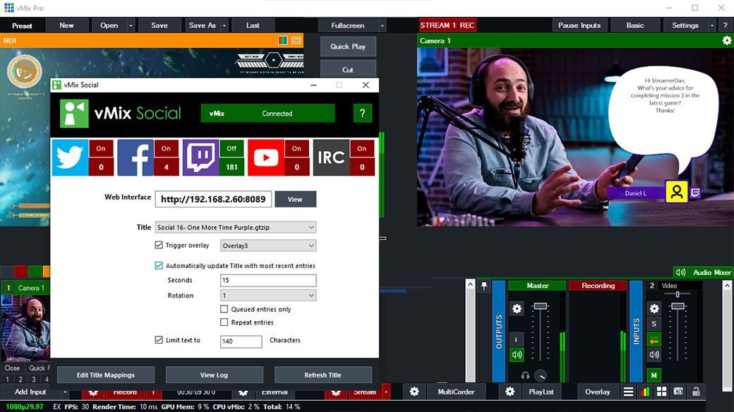 Başlıklar tüm üretim senaryoları için kullanılabilir. Sosyal medya sohbeti ve yorumları için vMix Social ile entegrasyon dahil. Veri kaynağı tetikleyicileriyle geçiş efektlerini otomatikleştirin. Kısayollarla veya başlık düzenleyici menüsü aracılığıyla başlık stilini anında değiştirin. Herhangi bir şeklin rengini değiştirme yeteneği dahil.